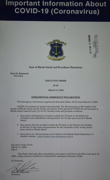 At Rhode Island T.F. Green International Airport in Warwick, the state’s only commercial airport and a major transportation hub, airport personnel are taking all necessary precautions to mitigate the spread of the virus and to cooperate with state health officials, according to John Goodman, the Director of Media and Public Relations for the Rhode Island Airport Corporation, which operates T.F. Green.